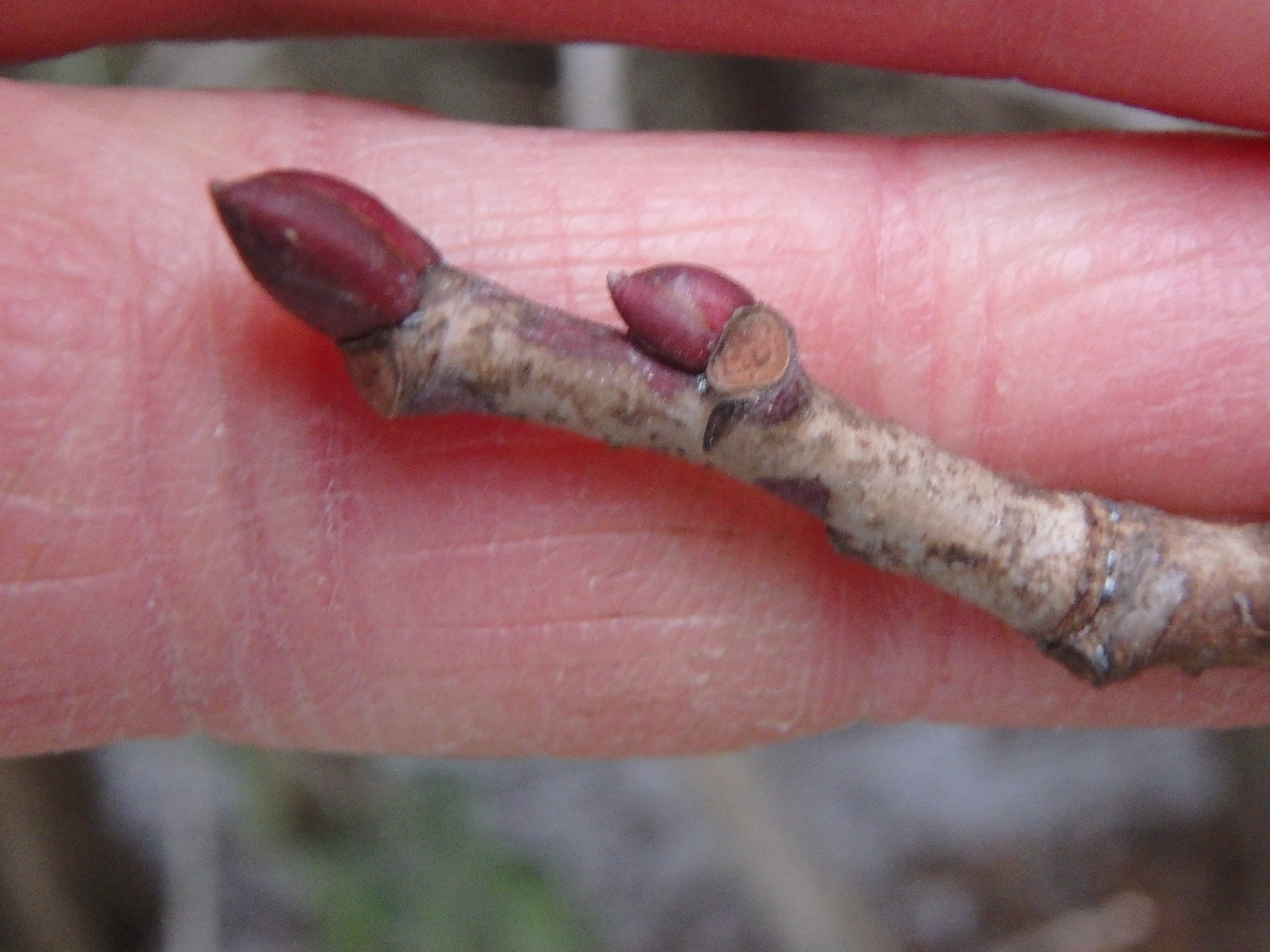 Beech. The buds on beech are long and pointy. But the most distinguishing characteristic is its smooth, gray bark. There is a beech fungal disease which can mar the bark, making it look like a bad case of acne.