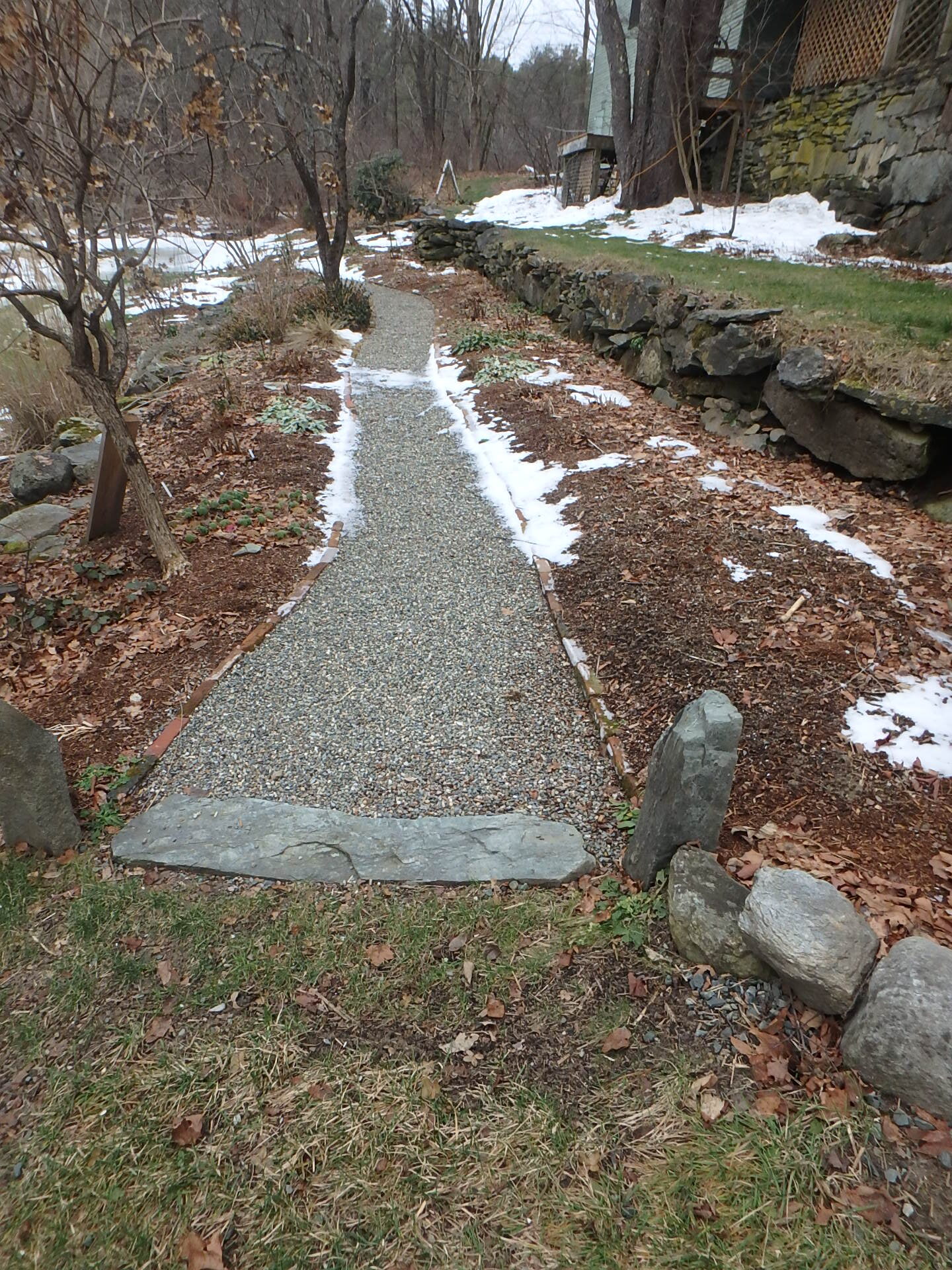 Pea stone pathway lined with bricks was a big project but worth it