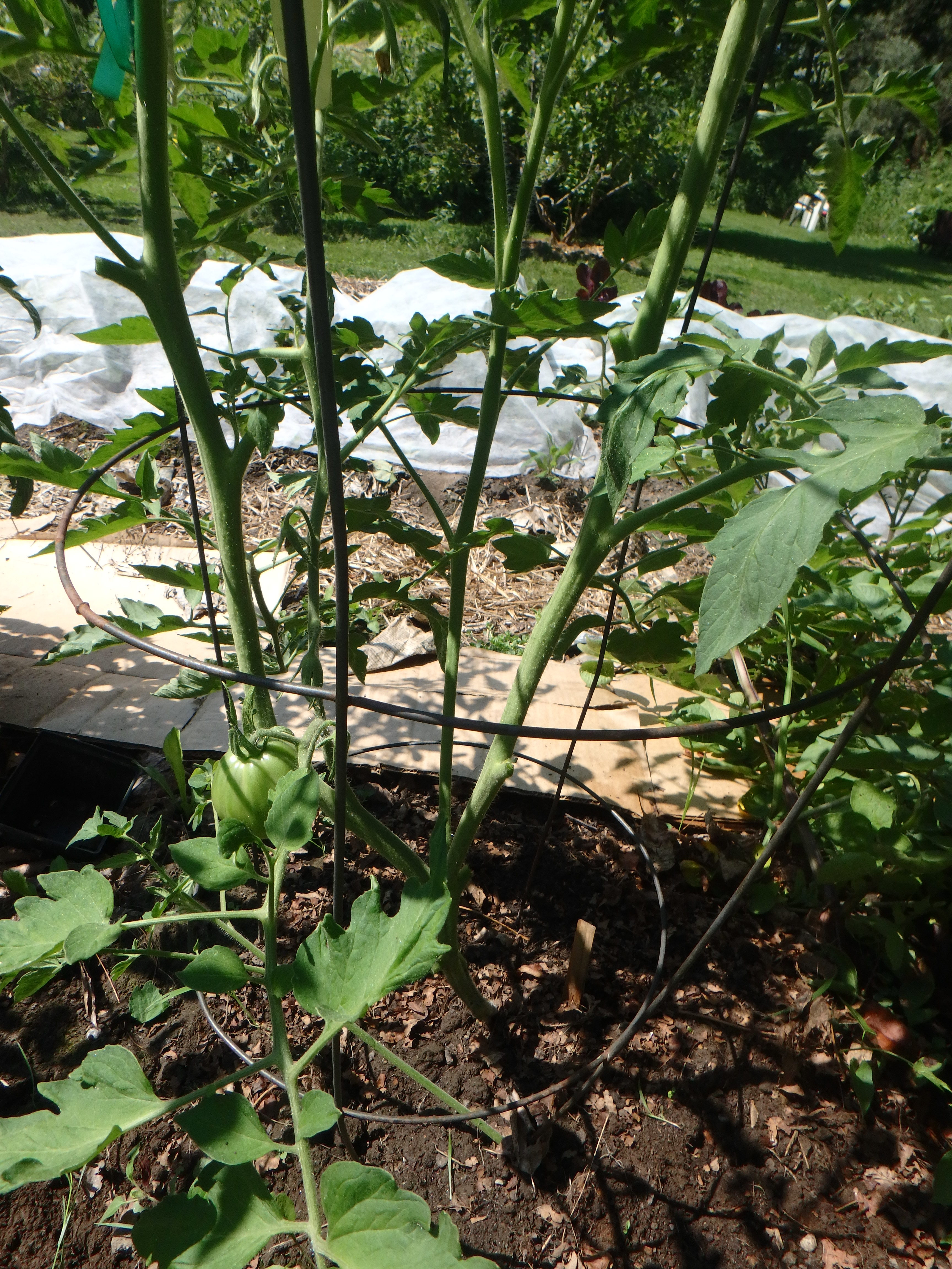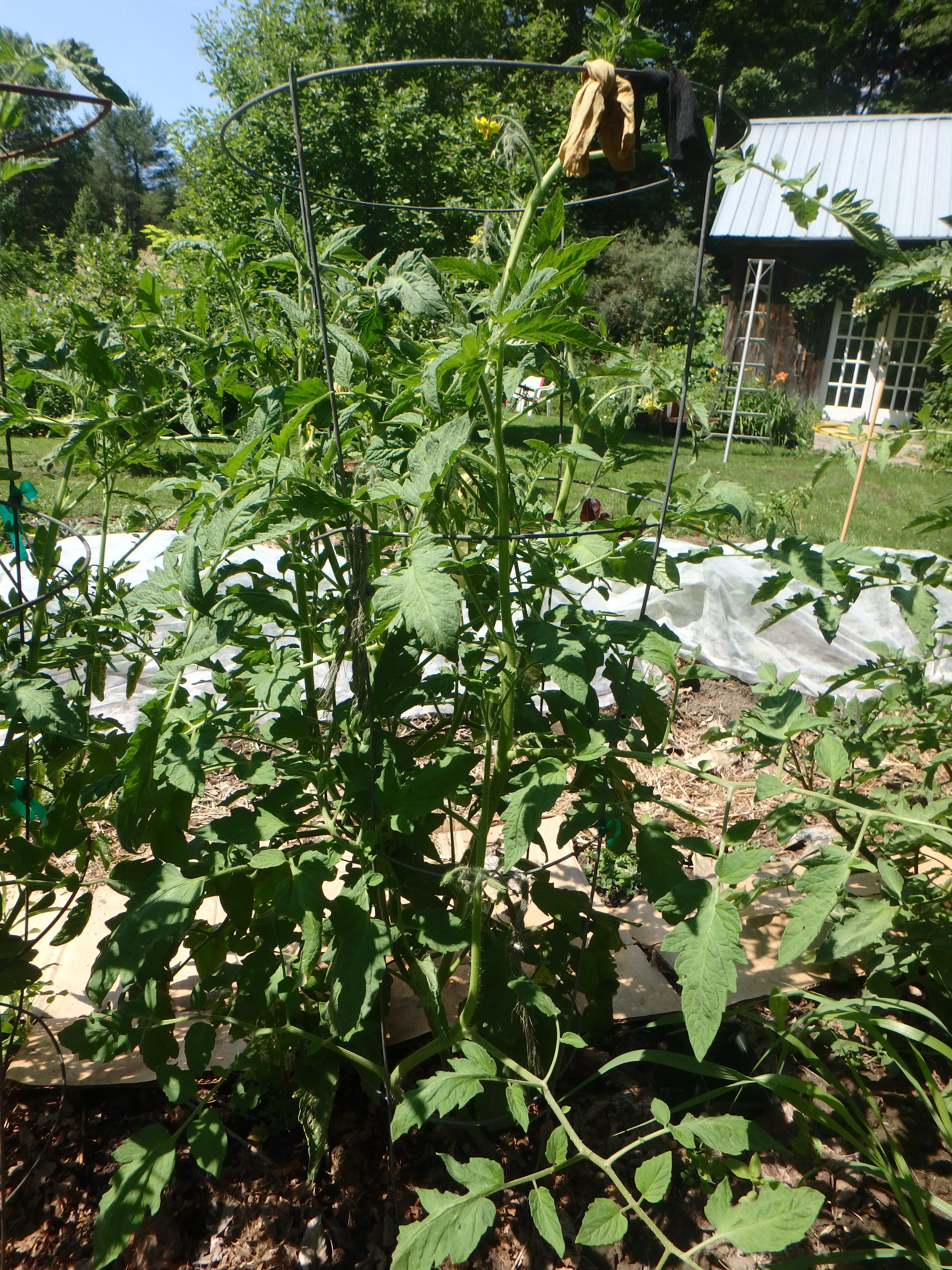 I contain my tomatoes in cages. I get the 54-inch tall ones, with 4 legs. They are expensive – $7 or $8 each, but worth the money as they last 20 years or so. Of course it’s too late now to cage your plants. But branches of tomatoes laying on the ground are very susceptible to diseases, even if you put down hay for them to lie on.