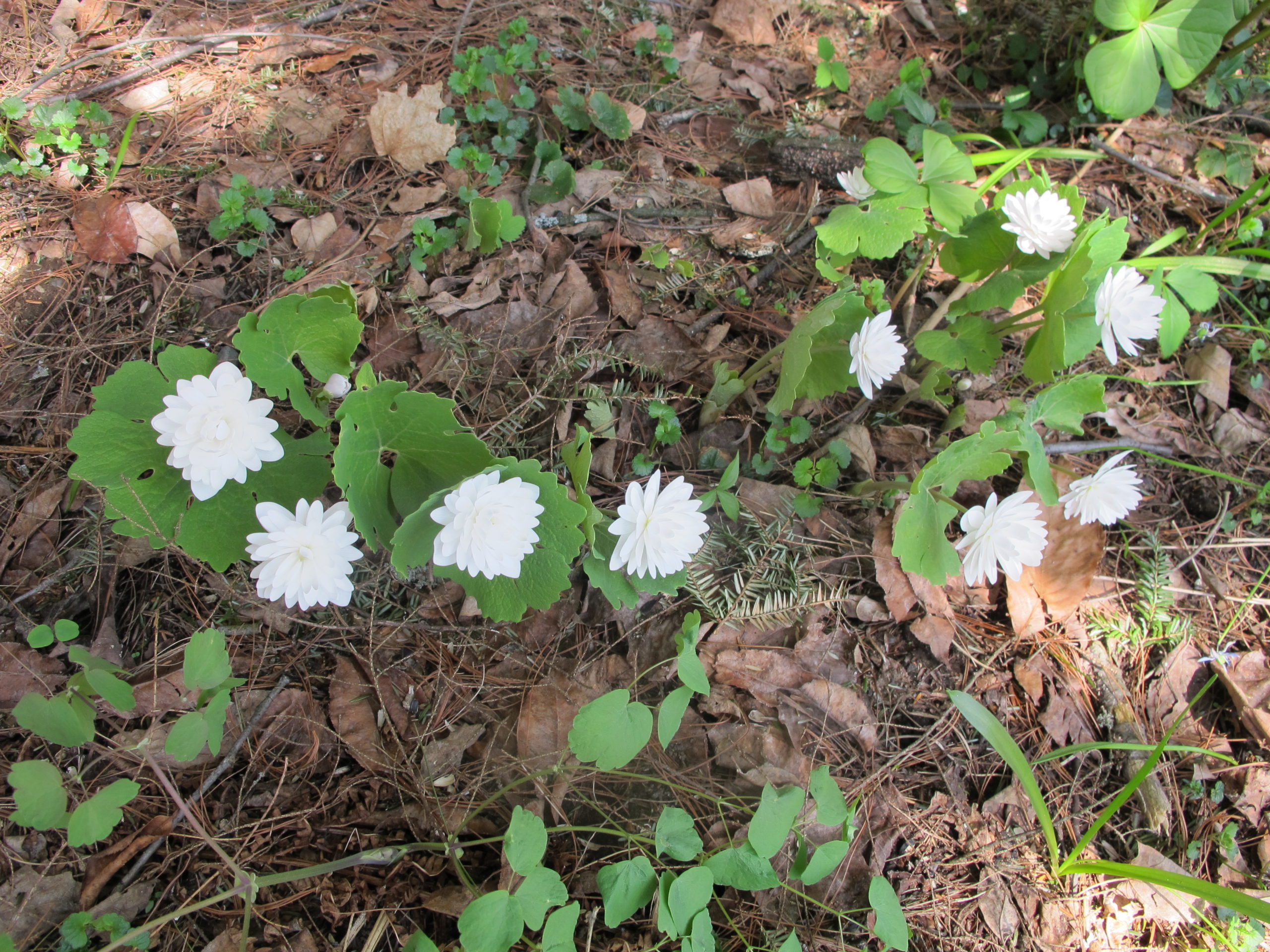 A friend gave me a small clump of double bloodroot about 15 years ago, and it has spread nicely. It is a tetraploid, meaning it has double the number of chromosomes, and is sterile, making it rare and expensive. I have divided mine and now have it in several places. Each blossom looks like a tiny white peony.