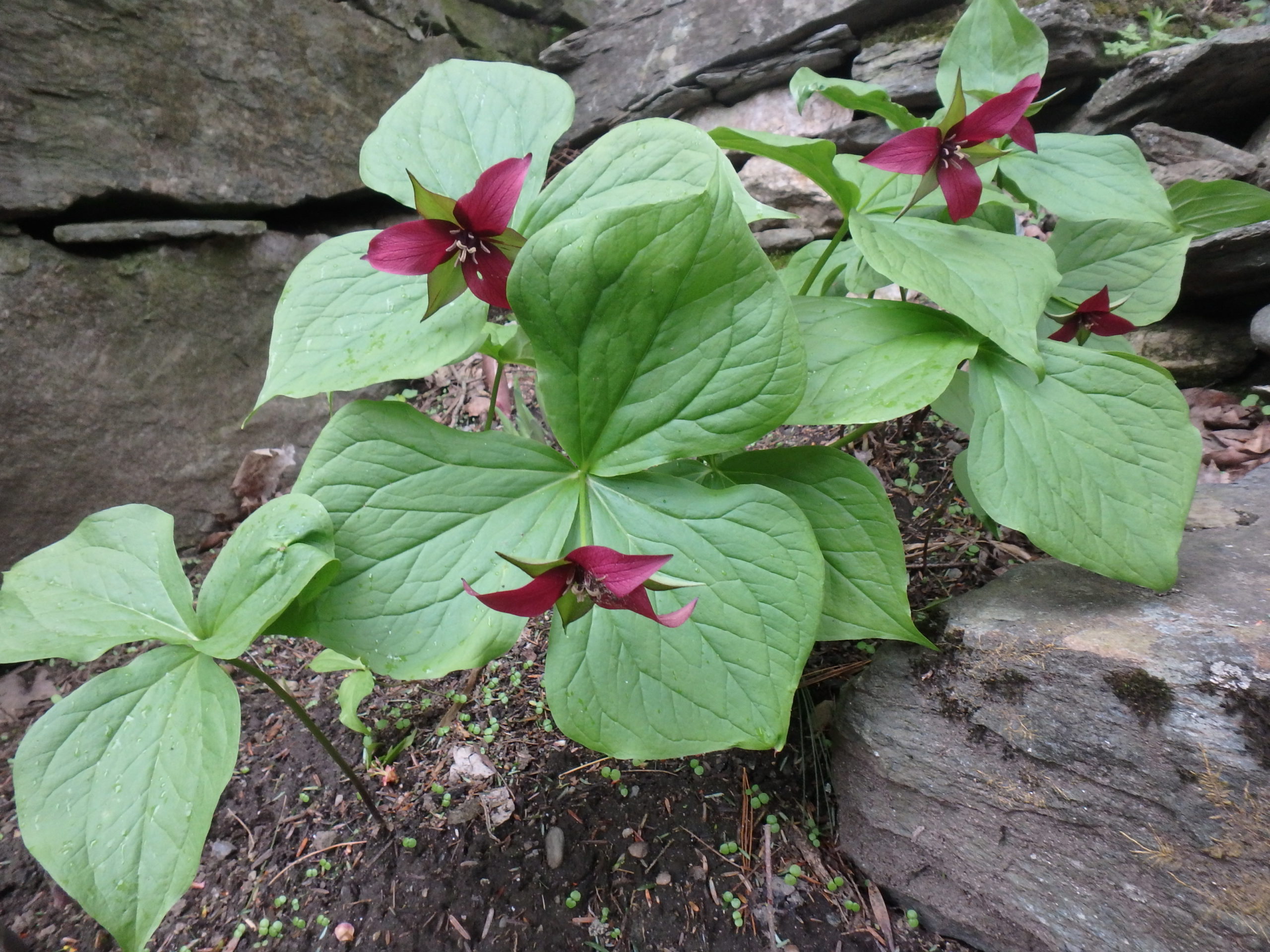 Trillium is a genus (botanical group) that includes several nice, easy-to-grow wildflowers. The red or purple trillium (Trillium erectum) is also known as wake-robin or stinking Benjamin for its earthy smell. It does well in dappled shade and rich, dark soil. I also grow a white trillium (Trillium grandiflorum) that grows alongside it. The white one turns pink later in the spring. Several other species exist, and are available from nurseries and specialty nurseries on-line.