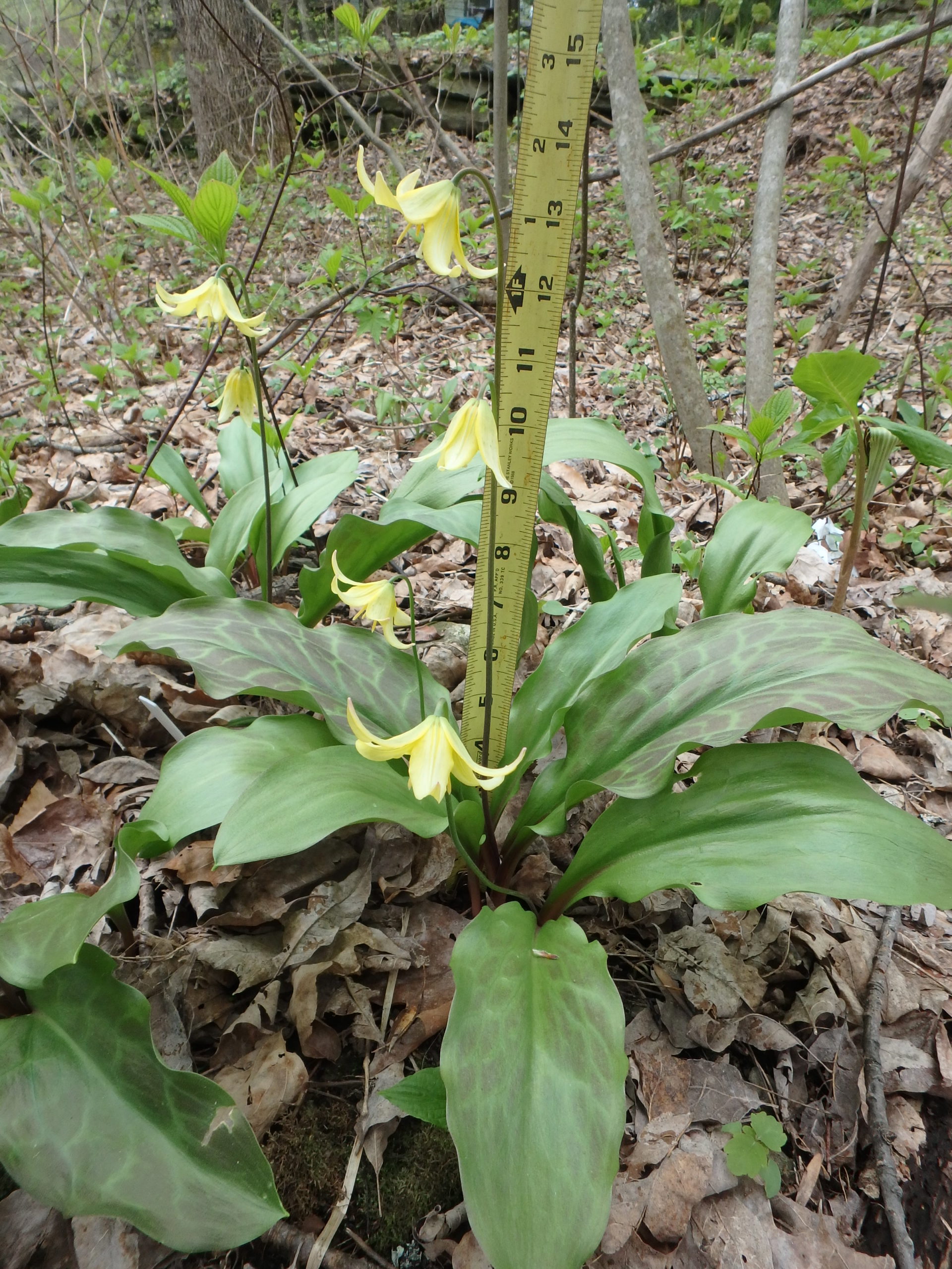 Three years ago I bought bulbs for a western form of trout lily that is much more dramatic than our native one. I neglected to label the bulbs other than to say they were Erythronium. Studying examples on the web I see Erythronium grandiflorum as one possibility, or a hybrid called ‘Pagoda’. My blossoms are on 12 inch stems, and each plant produces multiple blossoms. Definitely a fine addition to my woodland garden.