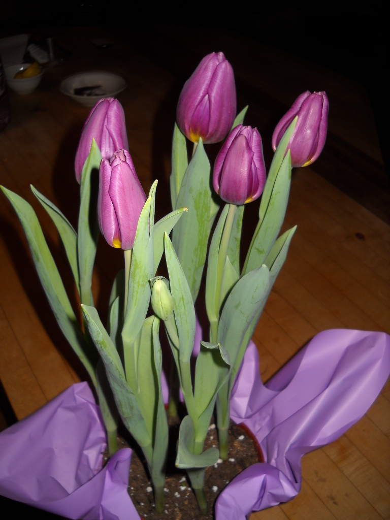 Winter is here and our flower gardens are, for the moment, just memories. But potted tulips in reds, purples and yellows are available at florist shops and grocery stores to brighten our spirits and grace our tables. For about $10 you, too, can have a few tulips in a 6-inch pot. If you keep them lightly watered and not too hot, they should last for at least a week.