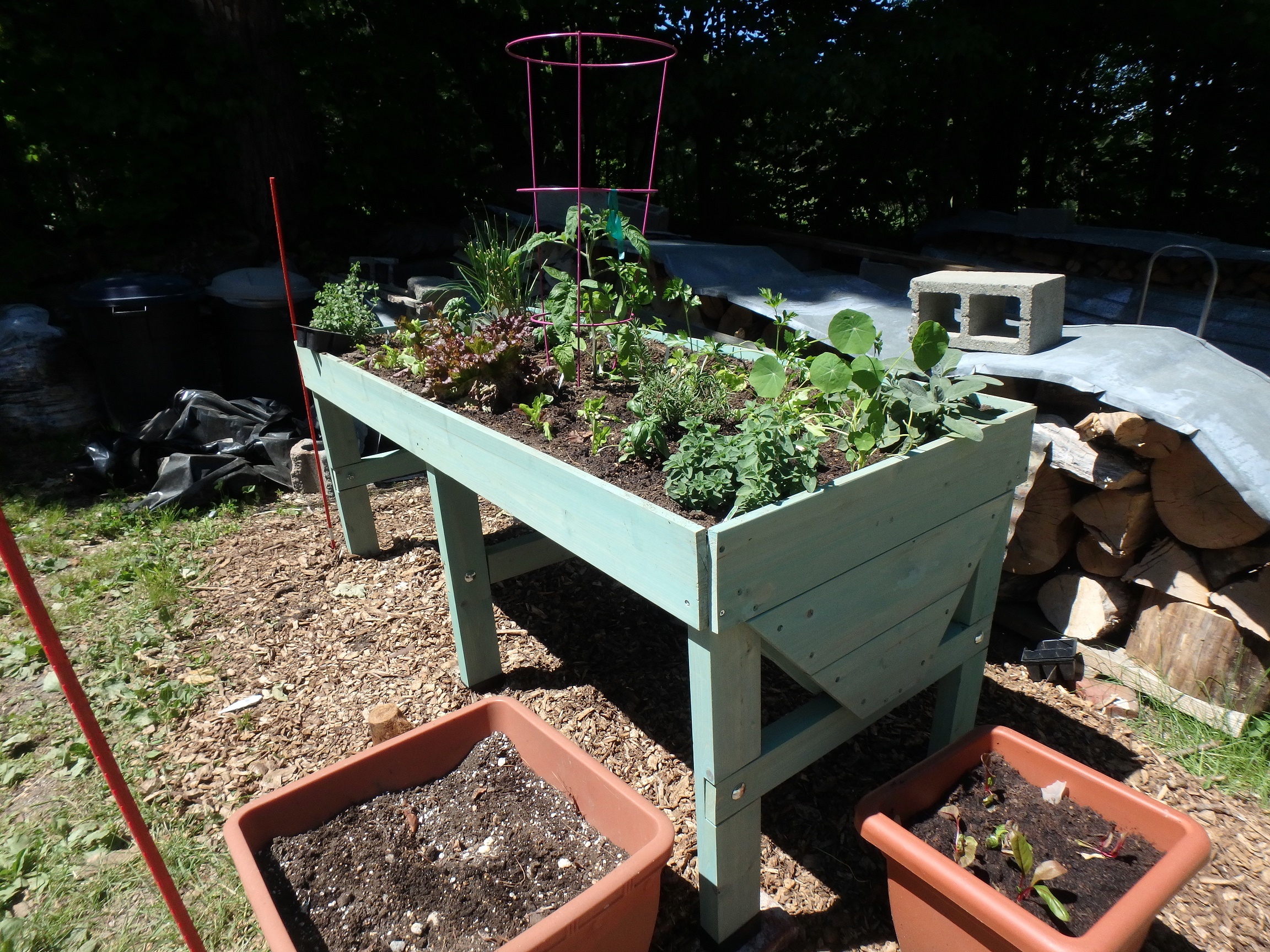 Let’s start at the high end. One of my coaching clients this summer wanted some raised beds that were actually tall enough so that she wouldn’t have to bend over. She ordered some ‘VegTrugs’ from Gardener’s Supply (www.gardeners.com or 802-660-3500). These are wood growing containers made of fir that are about 6 feet long, 30 inches wide and 32 inches tall – about the same height as your kitchen table.